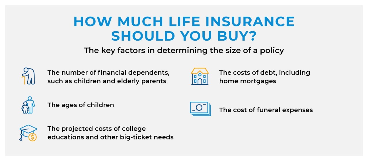 Conventional wisdom suggests purchasing a life insurance policy equal to 10 times the breadwinner’s annual income. But that multiple can shift depending on your age, the ages of your spouse and any children, how much debt the family has, as well as any other special circumstances. For example, if the breadwinner is also financially supporting aging family members, a larger policy may be needed. Likewise, business owners who anticipate that their company will grow or who expect to contribute to their surviving family members income should take these projections into consideration as they choose an appropriate level of life insurance coverage.