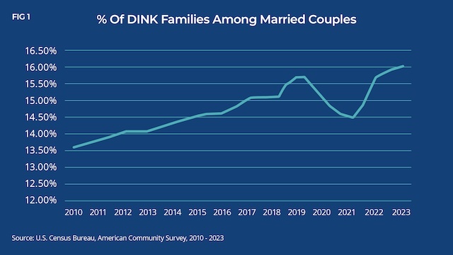 1 A DINK family is defined as a dual full-time employed married couple without children. Due to the COVID-19 pandemic, the 2020 DINK family data relies on 5-year ACS estimates instead of 1-year estimates from the U.S. Census Bureau.