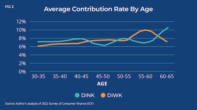 Using the data from the 2022 Survey of Consumer Finance, we first compared how DINK and DIWK families save through their employer-sponsored retirement plans at different life stages. As Figure 2 shows, despite having more disposable income, DINK families do not fully commit to retirement savings in their earlier years. Their average contribution rate before employer-matching is consistently below DIWK families until mid-career age. Research suggests that DINK households are typically enthusiastic spenders, especially allocating a majority of their resources to travel and pets, versus retirement savings.