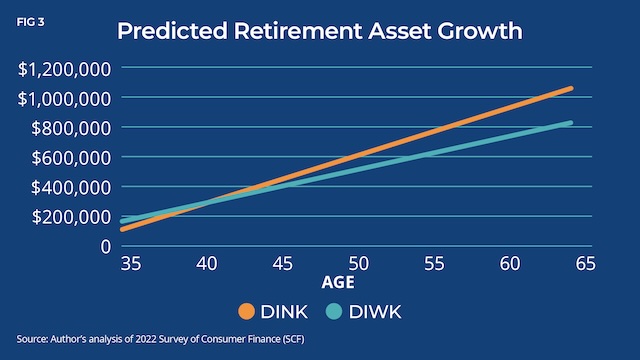 Next, we analyzed the retirement assets accumulated in employer-sponsored retirement plans and Individual Retirement Accounts (IRAs) for both DINK and DIWK families prior to age 65, a commonly assumed retirement age. When controlling for factors such as education level, income, and ethnicity for both respondents and their spouses/partners, a clear trend emerges: while DIWK families tend to have higher retirement assets earlier in their careers, DINK families surpass them after mid-career. This asset gap continues to grow, reaching approximately $200,000 in favor of DINK families when close to retirement age (Figure 3).
