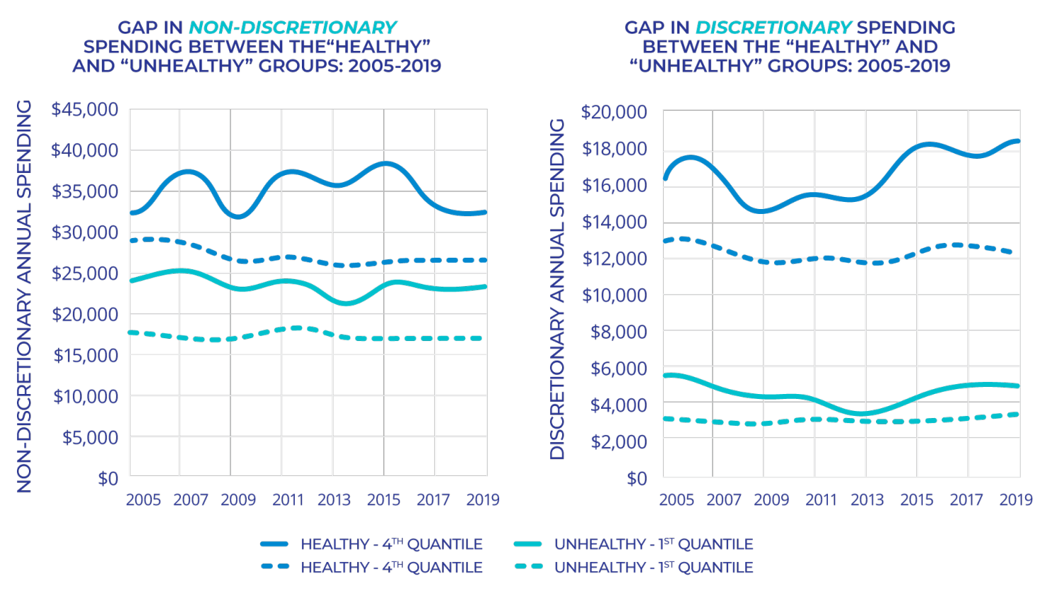 Lastly, the CAMS tracked the discretionary and non-discretionary non-medical spending of the same respondents separately over a decade. Therefore, we can compare spending patterns for both the “healthy” and “unhealthy” groups in different economic environments. Since individual spending patterns are often influenced by their wealth level, we further divided the net worth into quantiles to represent the effect of wealth.