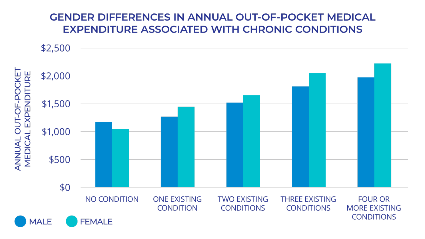The model also provides clear evidence that, on average, women are more likely than men to have out-of-pocket medical expenses. Researchers attribute this additional medical cost to emotional comfort, when women are sick, they tend to visit doctors more frequently for peace of mind rather than for actual treatment. The data also highlights the disparities in out-of-pocket medical expenses between women and men, particularly in cases of multiple co-existing chronic conditions. Figure 2 shows—after accounting for all relevant factors—women spend less than men when there are no existing chronic conditions. However, as the number of coexisting chronic conditions increases, women's out-of-pocket expenses rise and exceed those of men.