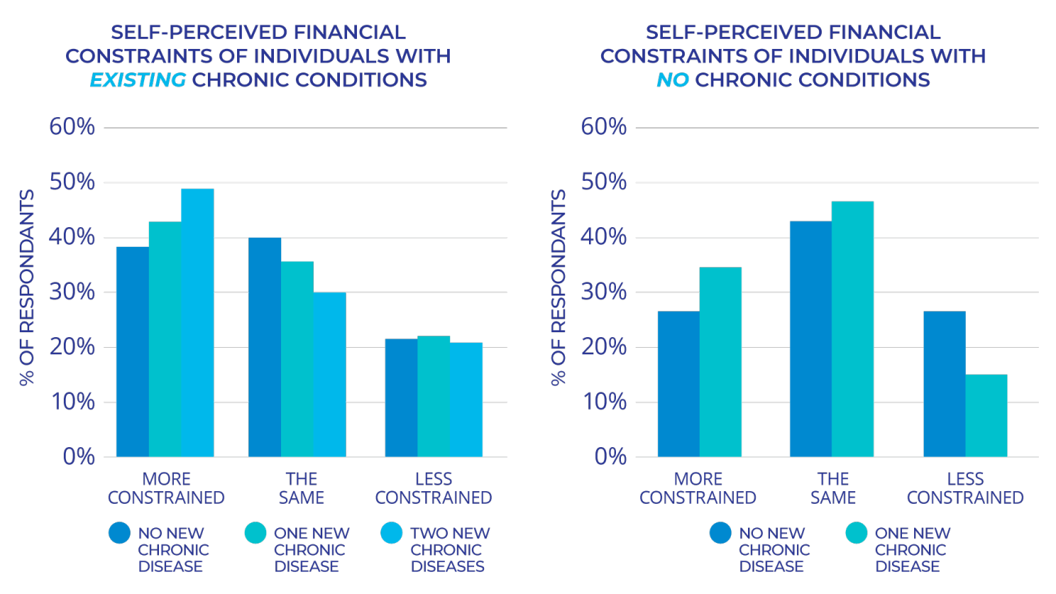 Initially, we explored participants' thoughts and feelings regarding their financial situation compared to the previous survey period. Figure 3 illustrates that a higher percentage of individuals in the unhealthy group expressed feeling more financially constrained than they did during the prior survey period. Notably, even individuals with previously good health who acquired new chronic conditions tended to experience a greater sense of constraint, as shown in Figure 4.
