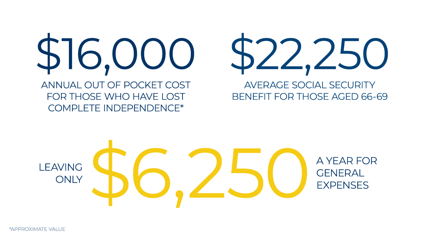 It is important to note that, according to the 2022 Social Security Administration Annual Report, the average annual Social Security benefit for individuals aged 66 to 69 is $22,250.9 Therefore, for those who rely solely on Social Security retirement income, handling the medical expenses associated with newly acquired chronic conditions can pose a significant financial burden, especially if they are already struggling with their daily living needs.