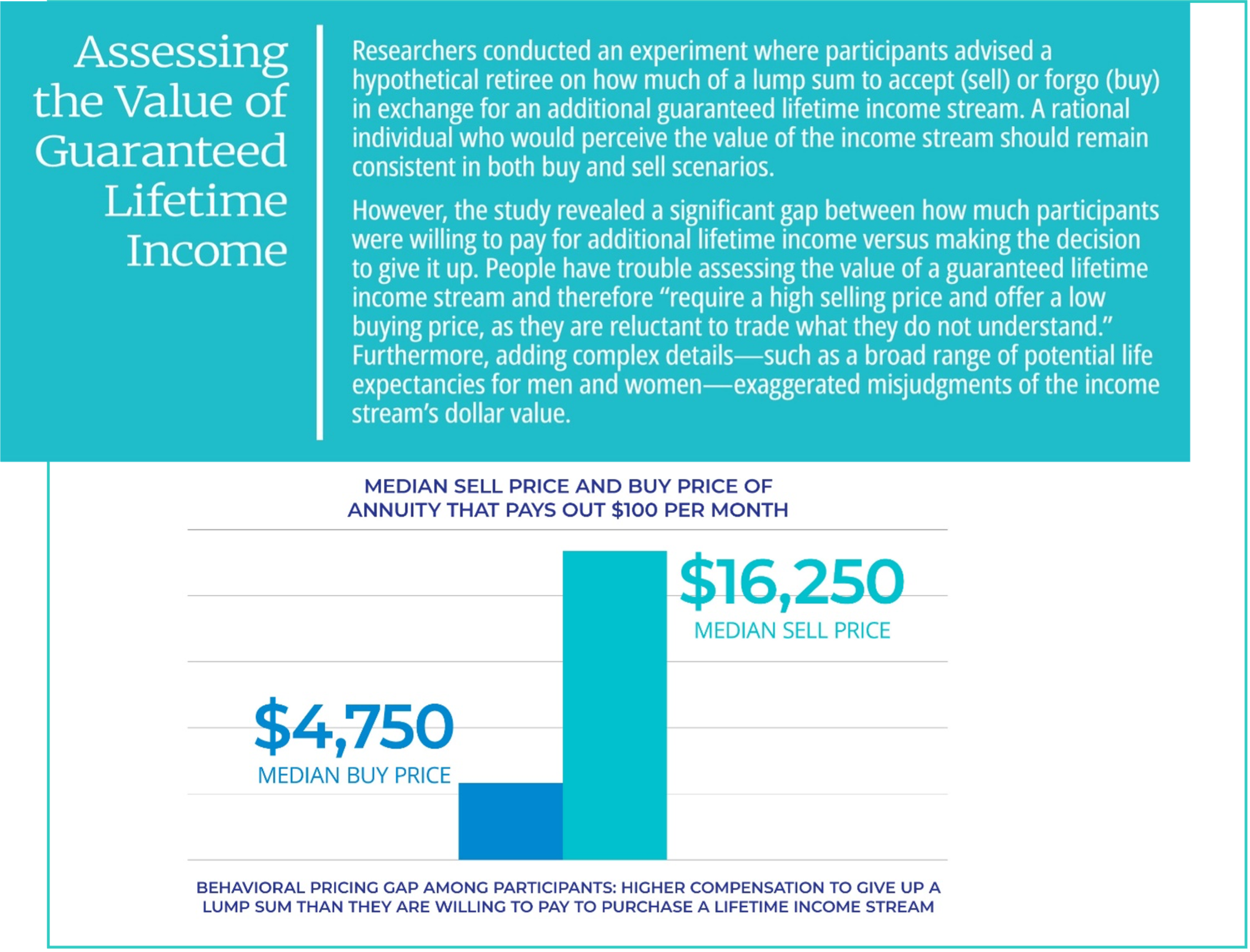 Researchers conducted experiments comparing individual preferences for lump-sum withdrawals versus lifetime income streams. The findings revealed that most participants still preferred the lump-sum option, even when the lifetime income option was actuarially fairly priced—essentially making it a “fair bet” between individuals and insurers. It further confirms that the lifetime income option likely has a “psychological cost” for participants, rather than a nominal dollar cost.