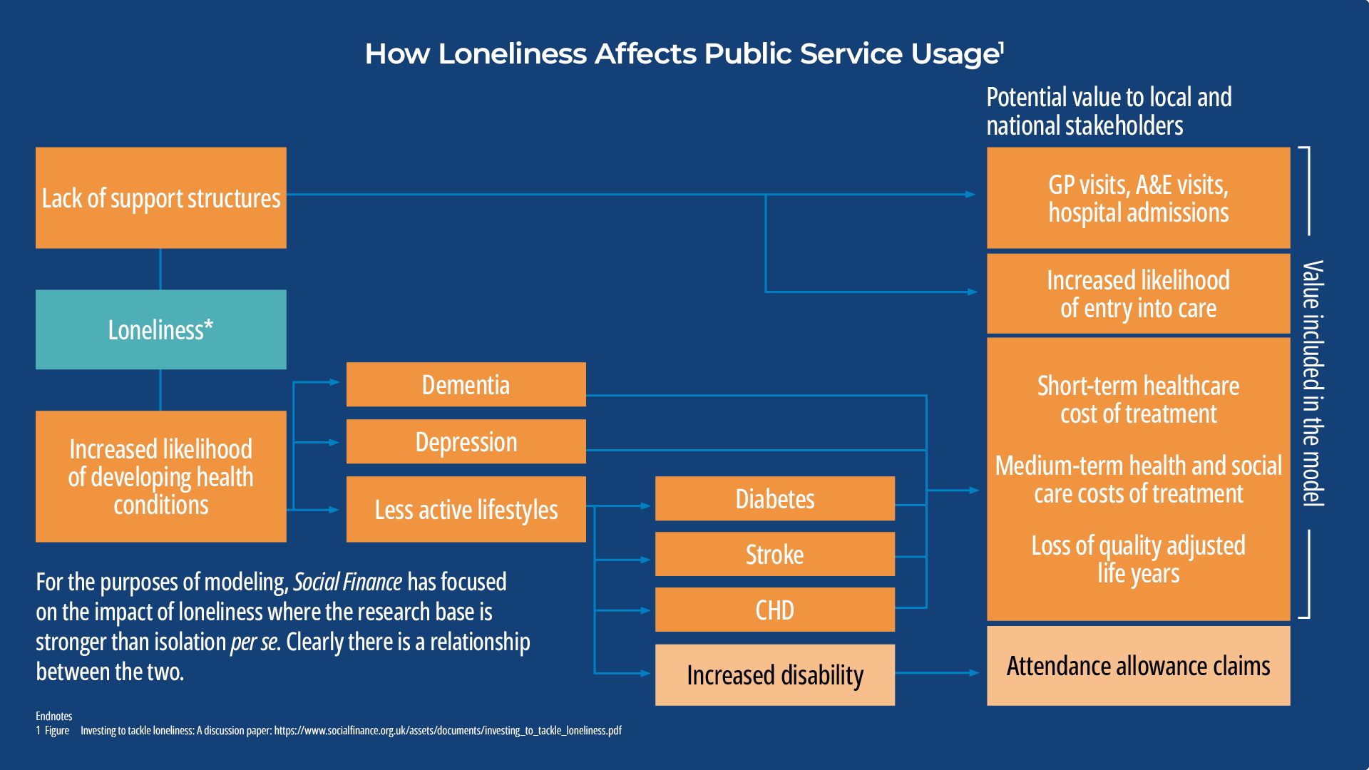 For the purposes of modeling, Social Finance has focused on the impact of loneliness where the research base is stronger than isolation per se. Clearly there is a relationship between the two.